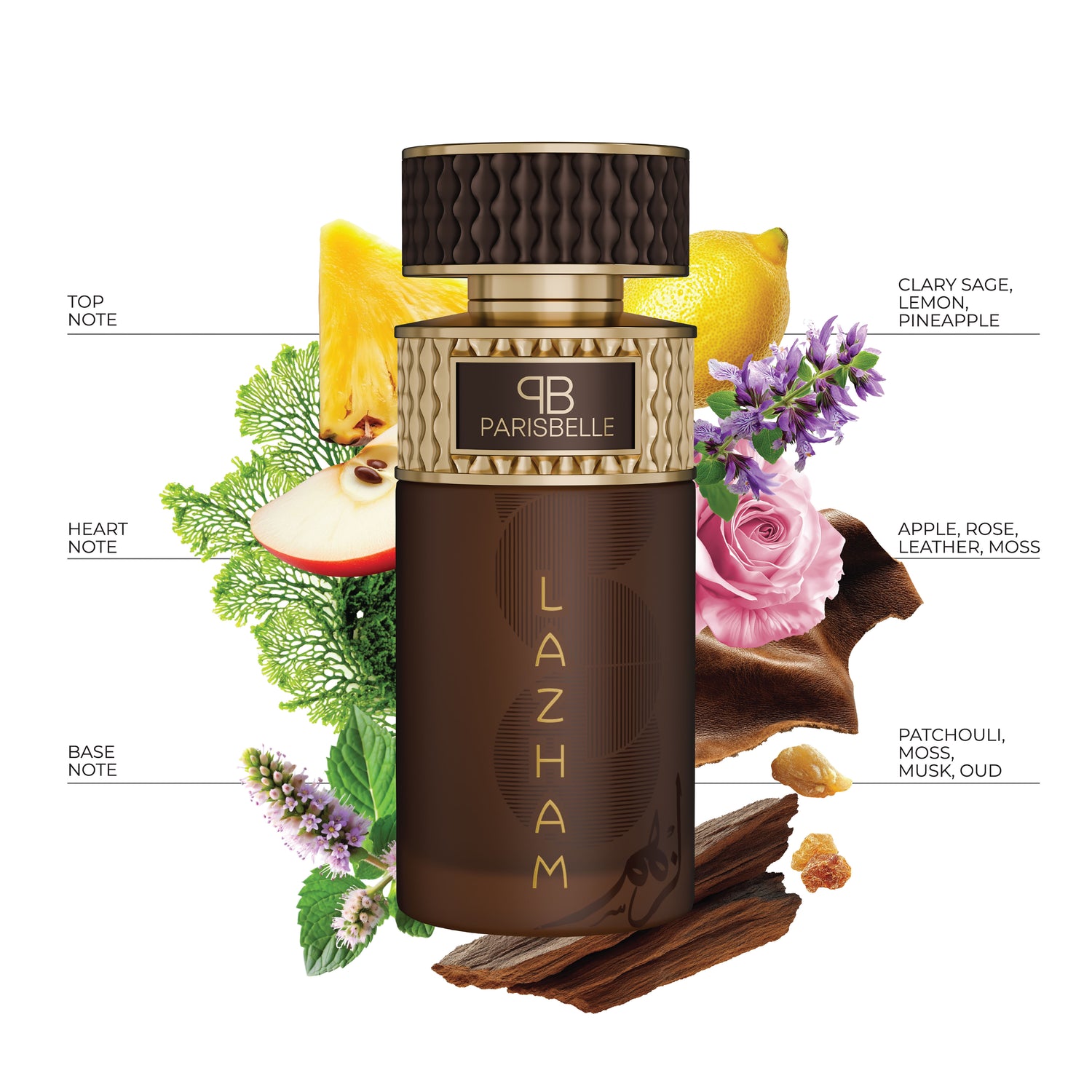 The journey begins with the crisp clarity of clary sage, bright lemon, and juicy pineapple, awakening the senses with freshness and vitality. At its heart, a refined blend of sweet apple, romantic rose, rugged leather, and earthy moss creates a rich and captivating contrast. Finally, the base unfolds with deep patchouli, sensual musk, and the majestic warmth of oud, leaving a powerful and unforgettable signature that speaks of strength and sophistication.